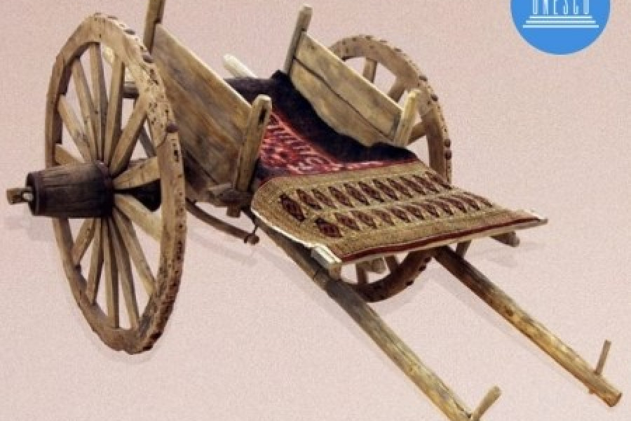 Ремесло изготовления телег. Тележка — это простое двухколесное сельскохозяйственное транспортное средство, которое тянет лошадь или осел и используется для перевозки грузов. Тележка в основном изготавливается из дерева, ее основные части — два колеса и две оси. Существует около 30 названий для частей телеги. Диаметр колеса телеги составляет около 140-150 см. Деревянная окружность ее колеса состоит из 9 спиц, каждая из которых крепится к 2 спицам, всего 18 спиц. Спица в телеге сама по себе представляет собой круглую деревянную часть колеса, состоящую из слегка изогнутых деревянных деталей. Спицы скрепляются друг с другом и фиксируются деревянными гвоздями. Спицы в телеге — это деревянные детали, которые соединяются с внешним ободом колеса с помощью шара, деревянные спицы колеса, и один конец спицы крепится к спицам, образующим внешний обод колеса.